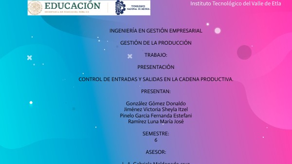 INGENIERÍA EN GESTIÓN EMPRESARIAL GESTIÓN DE LA PRODUCCIÓN TRABAJO: PRESENTACIÓN CONTROL DE ENTRADAS Y SALIDAS EN LA CADENA PRODUCTIVA. PRESENTAN: González Gómez Donaldo Jiménez Victoria Sheyla Itzel Pinelo Garcia Fernanda Estefani Ramírez Luna María José SEMESTRE: 6 ASESOR: L. A. Gabriela Maldonado cruz Santiago Suchilquitongo,Etla, Oaxaca.
