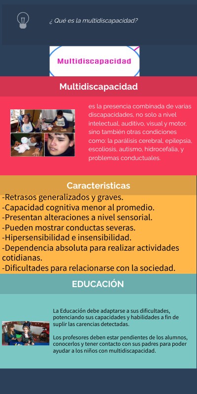 es la presencia combinada de varias discapacidades, no solo a nivel intelectual, auditivo, visual y motor, sino también otras condiciones como: la parálisis cerebral, epilepsia, escoliosis, autismo, hidrocefalia, y problemas conductuales.