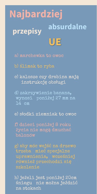 a) marchewka to owocb) ślimak to ryba c) kalosze czy drabina mają instrukcję obsługi d) zakrzywienie banana, wynosi poniżej 27 mm na 14 cm e) słodki ziemniak to owoc f) dzieci poniżej 8 roku życia nie mogą dmuchać balonów g) aby móc wejść na drzewo trzeba mieć specjalne uprawnienia, wcześniej również przechodzi się szkolenie h) jeżeli jest poniżej 20cm śniegu nie można jeździć na stokach