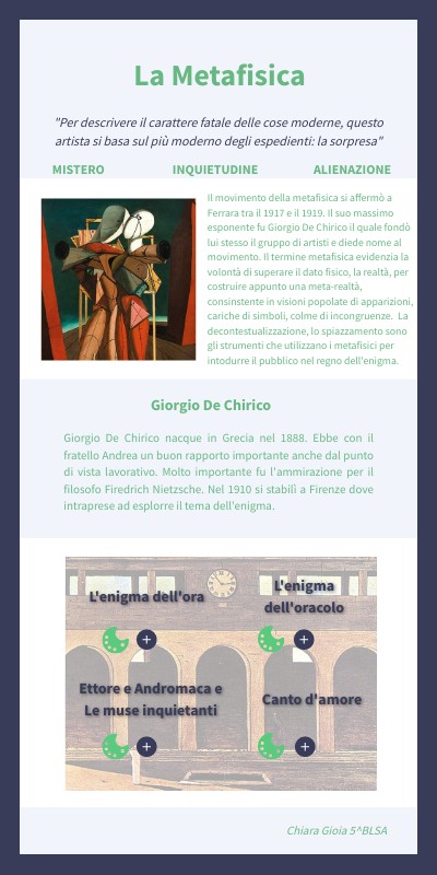 Il movimento della metafisica si affermò a Ferrara tra il 1917 e il 1919. Il suo massimo esponente fu Giorgio De Chirico il quale fondò lui stesso il gruppo di artisti e diede nome al movimento. Il termine metafisica evidenzia la volontà di superare il dato fisico, la realtà, per costruire appunto una meta-realtà, consinstente in visioni popolate di apparizioni, cariche di simboli, colme di incongruenze. La decontestualizzazione, lo spiazzamento sono gli strumenti che utilizzano i metafisici per intodurre il pubblico nel regno dell'enigma.