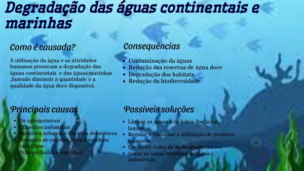 A utilização da água e as atividades humanas provocam a degradação das águas continentais e das águas marinhas ,fazendo diminuir a quantidade e a qualidade da água doce disponível.