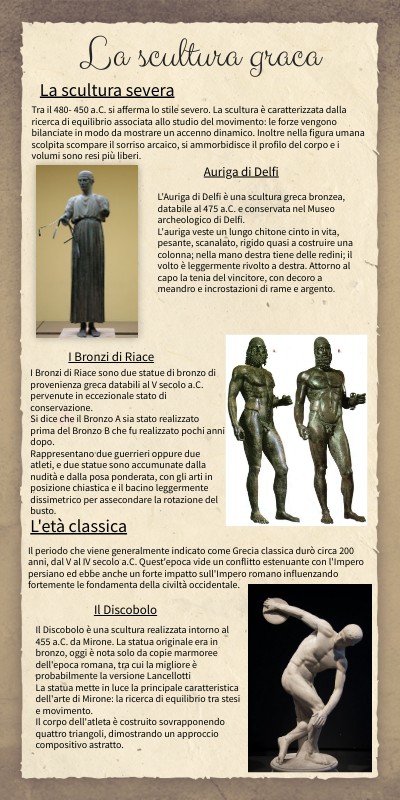Tra il 480- 450 a.C. si afferma lo stile severo. La scultura è caratterizzata dalla ricerca di equilibrio associata allo studio del movimento: le forze vengono bilanciate in modo da mostrare un accenno dinamico. Inoltre nella figura umana scolpita scompare il sorriso arcaico, si ammorbidisce il profilo del corpo e i volumi sono resi più liberi.