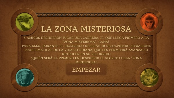 4 amigos decidieron jugar una carrera, el que llega primero a la "zona misteriosa", gana! para ello, durante el recorrido deberán ir resolviendo situacione problematicas de la vida cotidiana, que les permitirá avanzar o retrocer en su recorrido ¿quién será el primero en descubrir el secreto dela "zona misteriosa"