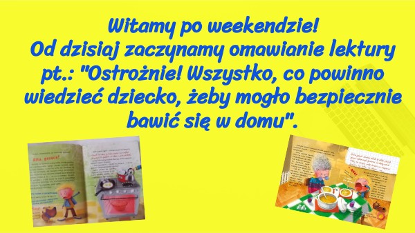 Witamy po weekendzie!Od dzisiaj zaczynamy omawianie lektury pt.: "Ostrożnie! Wszystko, co powinno wiedzieć dziecko, żeby mogło bezpiecznie bawić się w domu".