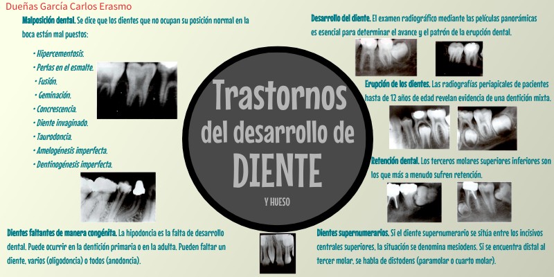 • Hipercementosis. • Perlas en el esmalte. • Fusión. • Geminación. • Concrescencia. • Diente invaginado. • Taurodoncia. • Amelogénesis imperfecta. • Dentinogénesis imperfecta.