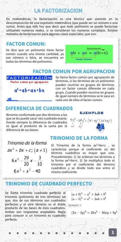 En matemáticas, la factorización es una técnica que consiste en la descomposición de una expresión matemática (que puede ser un número o una suma). Antes que tofo hsy que decir que todo polinomio se puede factorizar utilizando numeros reales, si se consideran los numeros complejos. Existen metodos de factorizacion para algunos casos especiales, que son: