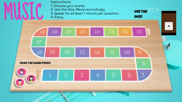 Instructions: 1. Choose your avatar. 2. Use the dice. Move accordingly. 3. Speak for at least 1 minute per question. 4. Enjoy