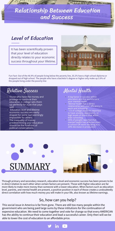 Through primary and secondary research, education level and economic success has been proven to be in direct relation to each other when certain factors are present. Those with higher education are far more likely to make more money than someone with a lower education. When factors such as education level, parents, and mental health are present, a positive position in each of those creates a undoubtedly direct correlation with how much money you will make in your life, also known as lifetime earnings.