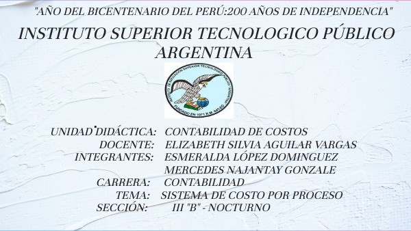 UNIDAD DIDÁCTICA: CONTABILIDAD DE COSTOS DOCENTE: ELIZABETH SILVIA AGUILAR VARGAS INTEGRANTES: ESMERALDA LÓPEZ DOMINGUEZ MERCEDES NAJANTAY GONZALE CARRERA: CONTABILIDAD TEMA: SISTEMA DE COSTO POR PROCESO SECCIÓN: III "B" - NOCTURNO