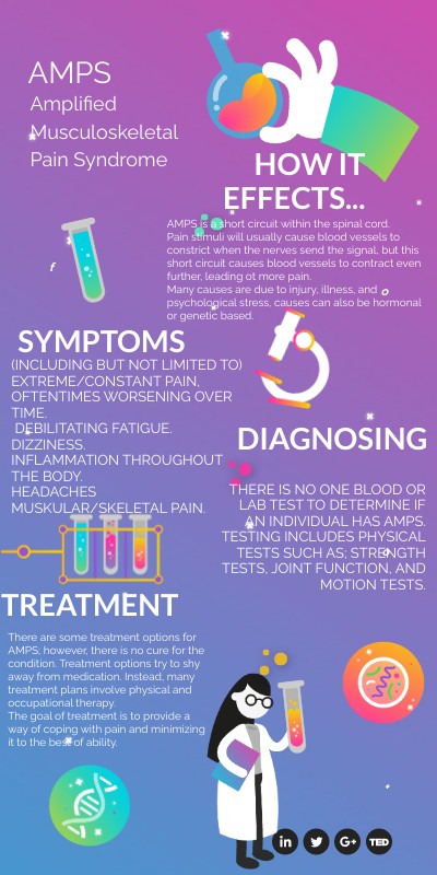 AMPS is a short circuit within the spinal cord.Pain stimuli will usually cause blood vessels to constrict when the nerves send the signal, but this short circuit causes blood vessels to contract even further, leading ot more pain. Many causes are due to injury, illness, and psychological stress, causes can also be hormonal or genetic based.
