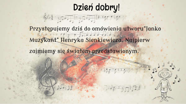 Przystępujemy dziś do omówienia utworu"Janko Muzykant" Henryka Sienkiewicza. Najpierw zajmiemy się światem przedstawionym.