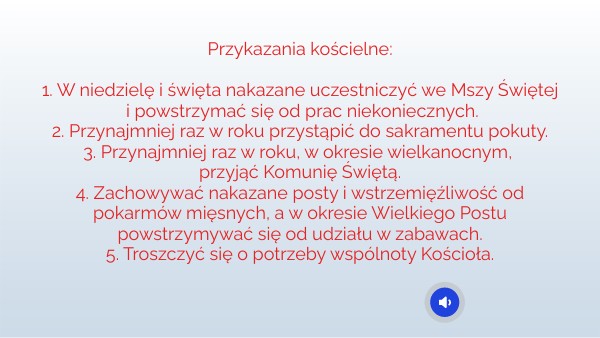 Przykazania kościelne:1. W niedzielę i święta nakazane uczestniczyć we Mszy Świętej i powstrzymać się od prac niekoniecznych. 2. Przynajmniej raz w roku przystąpić do sakramentu pokuty. 3. Przynajmniej raz w roku, w okresie wielkanocnym, przyjąć Komunię Świętą. 4. Zachowywać nakazane posty i wstrzemięźliwość od pokarmów mięsnych, a w okresie Wielkiego Postu powstrzymywać się od udziału w zabawach. 5. Troszczyć się o potrzeby wspólnoty Kościoła.