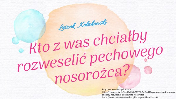 Przy tworzeniu korzydtałam z: https://view.genial.ly/5ec28c054a81770d9df54d40/presentation-kto-z-was-chcialby-rozweselic-pechowego-nosorozca https://www.teatrotekaszkolna.pl/konspekt/detal?id=246