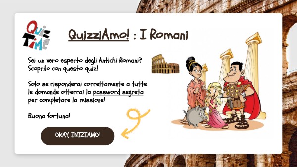 Sei un vero esperto degli Antichi Romani? Scoprilo con questo quiz! Solo se risponderai correttamente a tutte le domande, dopo ogni livello otterrai parte della password segreta che ti servirà per completare la missione! Buona fortuna!