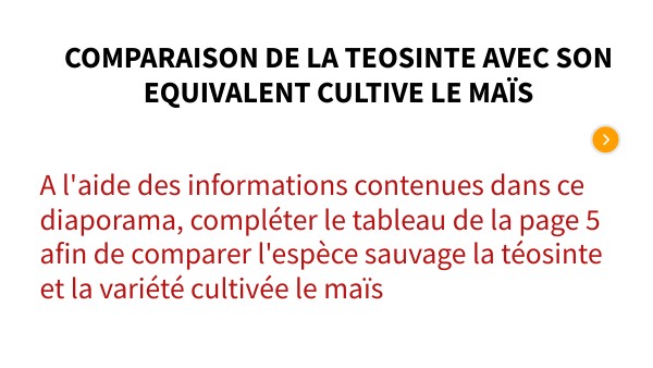A l'aide des informations contenues dans ce diaporama, compléter le tableau de la page 5 afin de comparer l'espèce sauvage la téosinte et la variété cultivée le maïs
