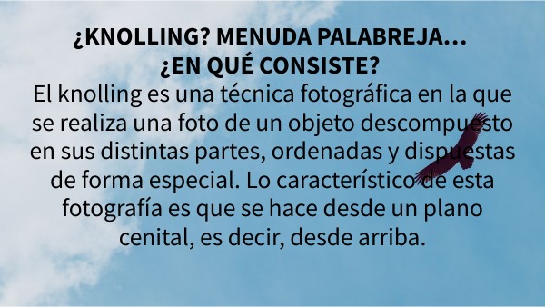 ¿KNOLLING? MENUDA PALABREJA… ¿EN QUÉ CONSISTE? El knolling es una técnica fotográfica en la que se realiza una foto de un objeto descompuesto en sus distintas partes, ordenadas y dispuestas de forma especial. Lo característico de esta fotografía es que se hace desde un plano cenital, es decir, desde arriba.