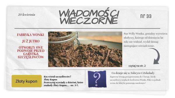 Ja, Willy Wonka, postanowiłem w bieżącym roku wpuścić do mojej fabryki piątkę dzieci - tylko piątkę i ani jednego więcej. Osobiście oprowadzę ową piątkę szczęśliwców po mojej fabryce i ujawnię przed nimi wszystkie jej tajemnice i całą magię. Następnie, nie koniec wizyty, każde z dzieci dostani w charakterze specjalnego prezentu tyle czekolady i słodyczy, że wystarczy mu ich do końca życia. Dlatego szukajcie Złotych Kuponów! Pięć Złotych Kuponów wydrukowanych na złotym papierze zostało ukrytych pod zwyczajnymi opakowaniami pięciu zwyczajnych tabliczek czekolady.