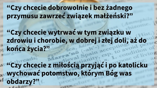 “Czy chcecie dobrowolnie i bez żadnego przymusu zawrzeć związek małżeński?” “Czy chcecie wytrwać w tym związku w zdrowiu i chorobie, w dobrej i złej doli, aż do końca życia?” “Czy chcecie z miłością przyjąć i po katolicku wychować potomstwo, którym Bóg was obdarzy?”