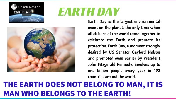 Earth Day is the largest environmental event on the planet, the only time when all citizens of the world come together to celebrate the Earth and promote its protection. Earth Day, a moment strongly desired by US Senator Gaylord Nelson and promoted even earlier by President John Fitzgerald Kennedy, involves up to one billion people every year in 192 countries around the world.
