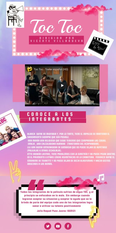 Mi personaje favorito es Federico, desde que lo vi, supe que el era el doctor. Su personaje me llamo mucho la attencion ya que su toc no tiene cura, segun la pelicula. Sin embargo el lo utilizo de forma positiva para ayudar a muchas personas. Y el les dio esperanza a todos los chicos y les dio de entender que cuando nos enfocamos en progresar todo se puede.