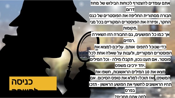 אתם עומדים להצטרף לכוחות הבילוש של מחוז דרום חבורה מסתורית החליפה את הפוסטרים של כנס החקר, ופיזרה את הפוסטרים המקוריים בכל מני מקומות. אך כמו כל הפושעים, גם החבורה הזו השאירה רמזים. כדי שנוכל לתפוס אותם. עליכם למצוא את הפוסטרים המקוריים, ולענות על שאלה אחת לכל פוסטר. אם תענו נכון, תקבלו מילה - וכל המילים יחד ירכיבו משפט. מצאו את 10 המילים הראשונות, חשפו את המשפט, ואז תוכלו למלא את טופס הסיכום. אם תהיו הראשונים לחשוף את הפושע הראשון - תזכו בפרס ?למה אתם מחכים !לעבודה