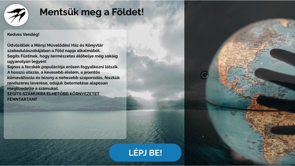 Üdvözöllek a Mányi Művelődési Ház és Könyvtár szabadulószobájában a Föld napja alkalmából. Játssz és segíts Füstinek, a fecskének.