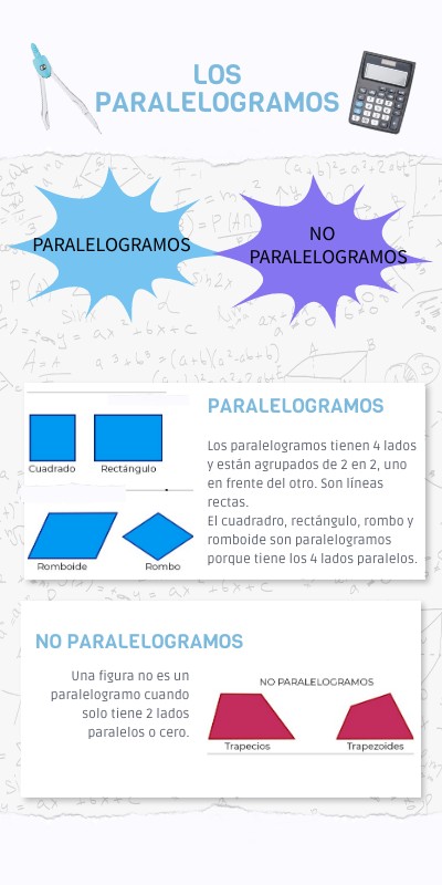 Los paralelogramos tienen 4 lados y están agrupados de 2 en 2, uno en frente del otro. Son líneas rectas. El cuadradro, rectángulo, rombo y romboide son paralelogramos porque tiene los 4 lados paralelos.