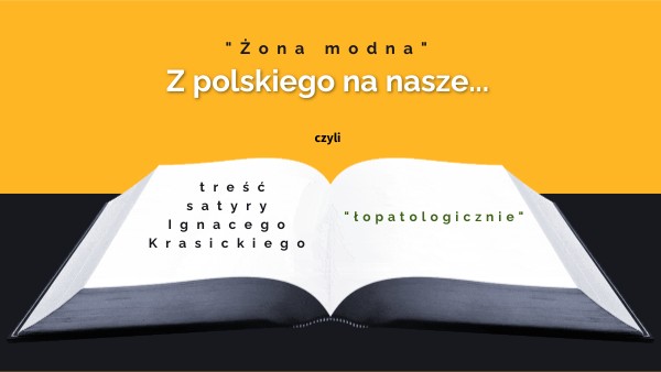 "A ponieważ dostałeś, coś tak drogo cenił, Winszuję, panie Pietrze, żeś się już ożenił". - "Bóg zapłać". - "Cóż to znaczy? Ozięble dziękujesz, Alboż to szczęścia swego jeszcze nie pojmujesz? Czyliż się już sprzykrzyły małżeńskie ogniwa?" - "Nie ze wszystkim; luboć to zazwyczaj tak bywa, Pierwsze czasy cukrowe". - "Toś pewnie w goryczy?" - "Jeszczeć!" - "Bracie, trzymaj więc, coś dostał w zdobyczy! Trzymaj skromnie, cierpliwie, a milcz tak jak drudzy, Co to swoich małżonek uniżeni słudzy, Z tytułu ichmościowie, dla oka dobrani, A jejmość tylko w domu rządczyna i pani, Pewnie może i twoja?" - "Ma talenta śliczne: Wziąłem po niej w posagu cztery wsie dziedziczne, Piękna, grzeczna, rozumna". - "Tym lepiej". - "Tym gorzej. Wszystko to na złe wyszło i zgubi mnie sporzej; Piękność, talent wielkie są zaszczyty niewieście, Cóż po tym, kiedy była wychowana w mieście". - "Alboż to miasto psuje?" - "A któż wątpić może? Bogdaj to żonka ze wsi!" - "A z miasta?" - "Broń Boże!