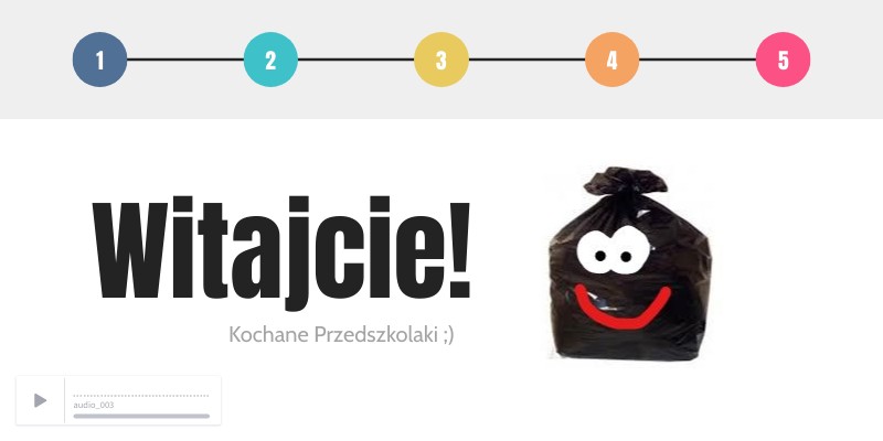 Pewnie zastanawiacie się, dlaczego stałem pod drzwiami Waszej sali... Uciekłem z piwnicy! Bo wiecie, stałem tam zupełnie sam, każdy przychodził tylko i wrzucał do mnie śmieci...NIe patrząc, czy jestem workiem na śmieci zmieszane, plastiki, szkło, odpady bio czy papier. Za chwilę zobaczycie, co we mnie jest! Wielki bałagan! NIe mogłem tak dłużej żyć! Mam nadzieję, że mi pomożecie wrócić do mojego posegregowanego życia! Pomożecie, prawda? Nade mną znajdują się numerki - 1, 2, 3, 4 i 5. Ukryłem tam dla Was zadania, dzięki którym mi pomożecie :)