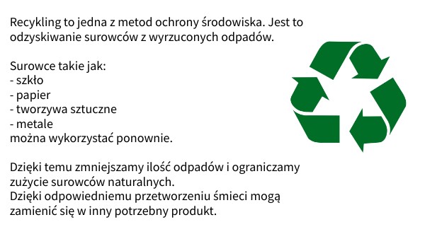 Recykling to jedna z metod ochrony środowiska. Jest to odzyskiwanie surowców z wyrzuconych odpadów. Surowce takie jak: - szkło - papier - tworzywa sztuczne - metale można wykorzystać ponownie. Dzięki temu zmniejszamy ilość odpadów i ograniczamy zużycie surowców naturalnych. Dzięki odpowiedniemu przetworzeniu śmieci mogą zamienić się w inny potrzebny produkt.