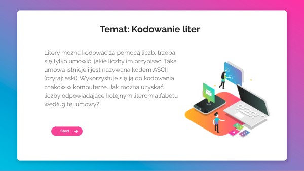 Litery można kodować za pomocą liczb, trzeba się tylko umówić, jakie liczby im przypisać. Taka umowa istnieje i jest nazywana kodem ASCII (czytaj: aski). Wykorzystuje się ją do kodowania znaków w komputerze. Jak można uzyskać liczby odpowiadające kolejnym literom alfabetu według tej umowy?