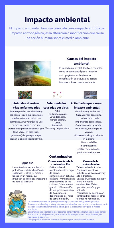 La contaminación es un grave problema para nuestro país y para el planeta. Tenemos muchos lagos, ríos y playas contaminadas, mucho aire contaminado, y esto trae consecuencias para nuestra salud, para la biodiversidad y para el medio ambiente. Es por ello que debemos tomar acciones para evitar la contaminación, tales como: Empezar el reciclaje en casa, Usar medios de transporte no contaminantes, No malgastar el agua, etc. Con pequeñas acciones podemos lograr un gran cambio en el planeta
