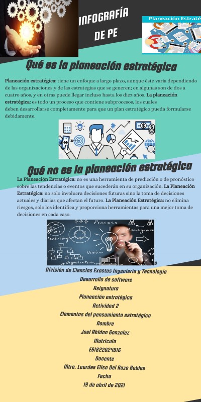 Universidad Abierta y a Distancia de México División de Ciencias Exactas Ingeniería y Tecnología Desarrollo de software Asignatura Planeación estratégica Actividad 2 Elementos del pensamiento estratégico Nombre Joel Abidan Gonzalez Matricula ES1822024816 Docente Mtra. Lourdes Elisa Del Razo Robles Fecha 19 de abril de 2021