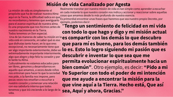 “Tengo un sentimiento de felicidad en mi vida con todo lo que hago y digo y mi misión actual es compartir con los demás lo que descubro que para mí es bueno, para los demás también lo es. Esto lo logro siguiendo mi pasión que es descubrir e inventar lo que sea que me permita evolucionar espiritualmente hacia un bien común”. Otro ejemplo, es decir: “Pido a mi Yo Superior con todo el poder de mi intención que me ayude a encontrar la misión para la que vine aquí a la Tierra. Hecho está, Que así sea, Aquí y ahora, Gracias.”