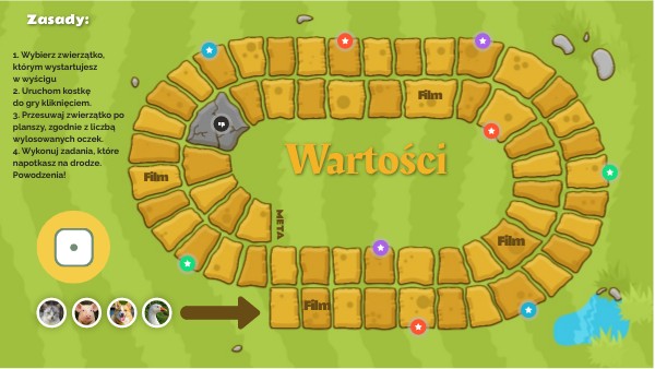 1. Wybierz zwierzątko, którym wystartujesz w wyścigu 2. Uruchom kostkę do gry kliknięciem. 3. Przesuwaj zwierzątko po planszy, zgodnie z liczbą wylosowanych oczek. 4. Wykonuj zadania, które napotkasz na drodze. Powodzenia!