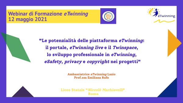 "Le potenzialità delle piattaforma eTwinning: il portale, eTwinning live e il Twinspace, lo sviluppo professionale in eTwinning, eSafety, privacy e copyright nei progetti"