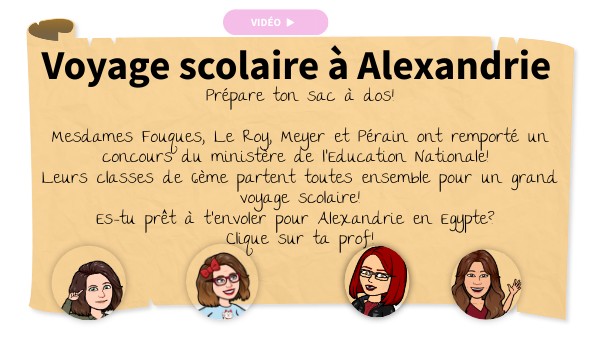 Prépare ton sac à dos! Mesdames Fouques, Le Roy, Meyer et Pérain ont remporté un concours du ministère de l'Education Nationale! Leurs classes de 6ème partent toutes ensemble pour un grand voyage scolaire! Es-tu prêt à t'envoler pour Alexandrie en Egypte? Clique sur ta prof!