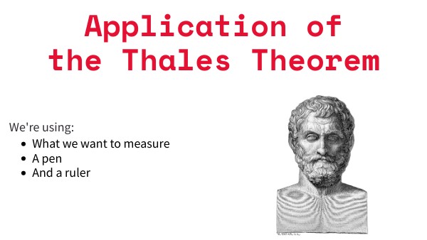 Thales' theorem tells us that, if the two triangles that make up these objects are proportional, then dividing the height of the pen by its shadow gives us the same thing as dividing the height of the other object by its shadow.