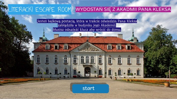 Jesteś bajkową postacią, która w trakcie odwiedzin Pana Kleksa zabłądziła w budynku jego Akademii. Musisz odnaleźć klucz aby wrócić do domu.