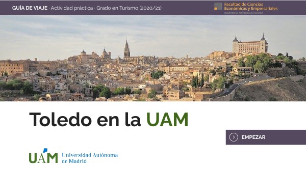 El objetivo principal de esta actividad es acercar a los estudiantes del Grado en Turismo la ciudad de Toledo como sitio de interés cultural desde diferentes disciplinas. Dada la situación sanitaria en la que nos encontramos, no hemos querido que os quedéis sin este viaje que, anualmente, solemos hacer con vosotros, por lo que vamos a "traer" dicha ciudad a las aulas de la UAM para que la conozcáis a través de una actividad dinamizada.