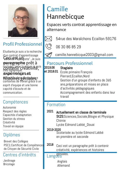 Etudiante,je suis a la recherche d'un contrat d'apprentissage "Jardinier Paysagiste". Je suis une personne très motivée,j'aime la nature,je suis très dynamique.Je sais m'integer sans difficultés dans de nouveaux contextes de travail grâce à un esprit d'equipe et une bonne capcité d'écoute et de communication.