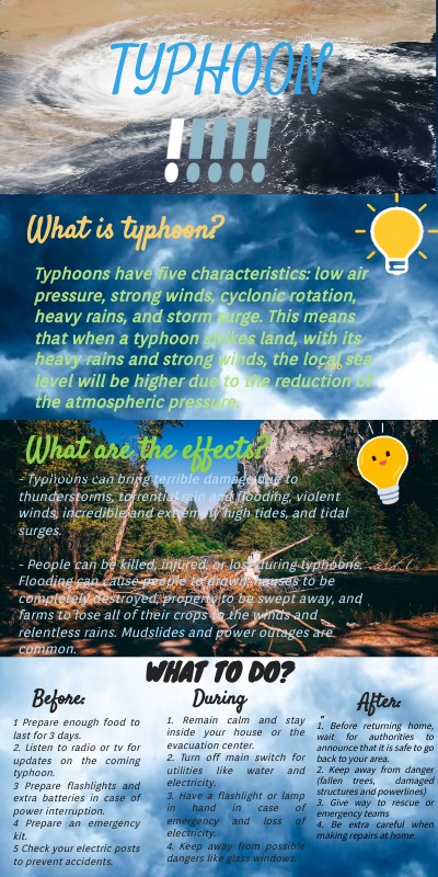 1 Prepare enough food to last for 3 days.2. Listen to radio or tv for updates on the coming typhoon. 3 Prepare flashlights and extra batteries in case of power interruption. 4 Prepare an emergency kit. 5 Check your electric posts to prevent accidents.