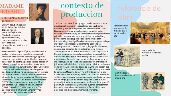 -Madame Bobary es una novela de movimiento realista que fue escrita por Gustave Flaubert y publicada en el año 1856 .El primer indicio de Emma Rouault es cuando conoce a Charles Bobary ya que atiende a su padre debido a la lesión de su pierna Luego comienzan a verse por gusto a lo cual todos están de acuerde excepto la madre de Charles por su nula participación en los preparativos de la boda. Luego de la ceremonia comienzan a vivir una vida matrimonial, pero Emma cae en cuenta de que su relación no era apasionada y romántica como anhelaba ya que Charles era bastante frio a pesar de los intentos de Emma por mejorar la relación. El matrimonio Bovary es invitado a un baile organizado por el duque donde Emma se enamora de los lujosos estilos de vida, de los extravagantes vestidos y exóticos platillos. A pesar de que Emma con el recuerdo de esta fiesta se mantiene feliz por un tiempo su vida seguía siendo aburrida y monótona. -Tras esto Emma enferma de los nervios por lo cual su medico le recomienda ir a vivir a un lugar mas relajado.
