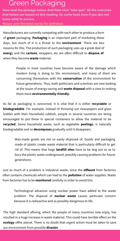 Now read the passage below. And then click "take quiz". All the exercises that follow are based on this reading. So come back here if you don not know what to answer.Mouse over the bold words for definition.