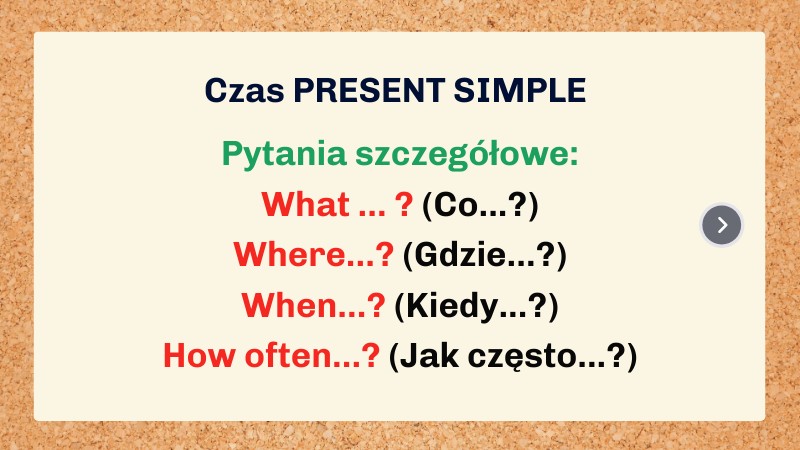 Pytania szczegółowe:What ... ? (Co...?) Where...? (Gdzie...?) When...? (Kiedy...?) How often...? (Jak często...?)