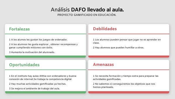 1 Se necesita formación y tiempo extra para preparar las actividades gamificadas. 2 No sabemos si conseguiremos los objetivos que nos hemos planteado.