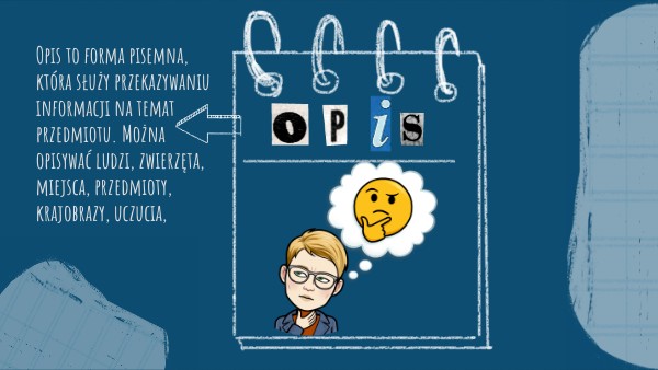 Opis to forma pisemna, która służy przekazywaniu informacji na temat przedmiotu. Można opisywać ludzi, zwierzęta, miejsca, przedmioty, krajobrazy, uczucia,