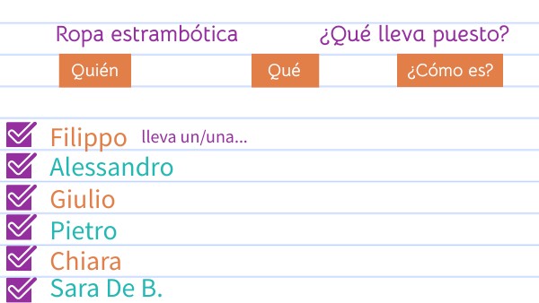 En la clase de español hemos hecho un desfile de ropa estrambótica, mi compañero X....llevaba.... ....yo llevaba...