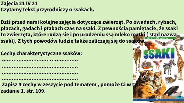 Zajęcia 21 IV 21 Czytamy tekst przyrodniczy o ssakach. Dziś przed nami kolejne zajęcia dotyczące zwierząt. Po owadach, rybach, płazach, gadach i ptakach czas na ssaki. Z pewnością pamiętacie, że ssaki to zwierzęta, które rodzą się i po urodzeniu ssą mleko matki ( stąd nazwa ssaki). Z tych powodów ludzie także zaliczają się do ssaków. Cechy charakterystyczne ssaków: .............................................. .............................................. .............................................. .............................................. Zapisz 4 cechy w zeszycie pod tematem , pomoże Ci w tym, zadanie 1. str. 109.