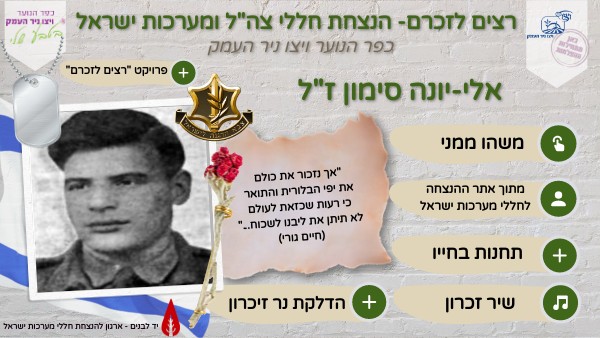 שם החלל שבחרתי להנציח: אלי-יונה סימון מדוע בחרתי להנציח חלל זה: בחרתי להנציח חלל זה משום שהתעניינתי בסיפור שלו ולפי דעתי הסיבה שבגללה הוא מת היא נגרמה אך ורק מפני רשלנות, לא שלו, אלא של אנשים אחרים שלא השגיחו עליו. עורך: יועד יאסו